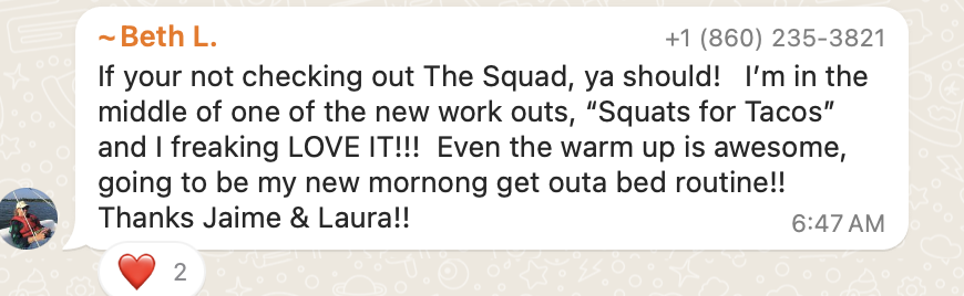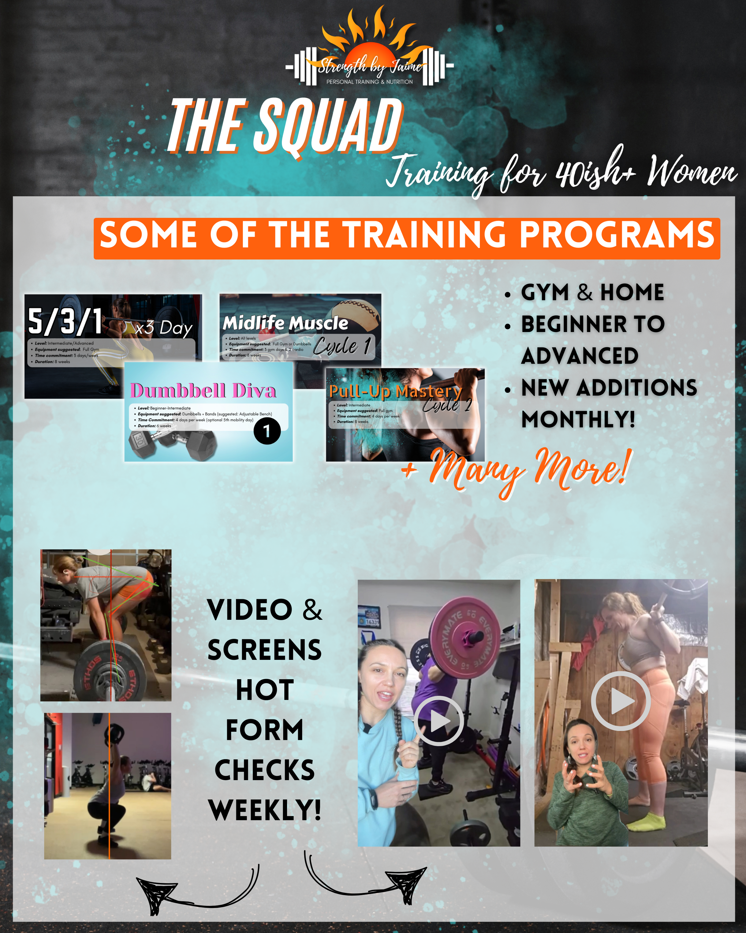 At anytime you can elevate into The Squad 1:1 where you can get weekly check-ins, a custom tailored training program and private form checks throughout the week.