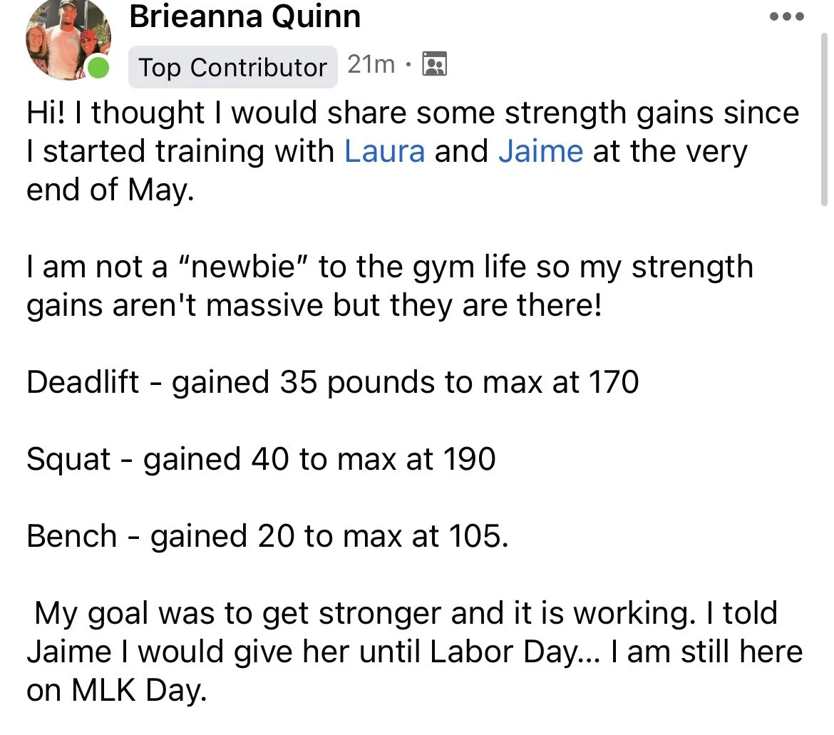 “I finally learned not to worry about the number on the scale, but how my clothes fit and how I feel. Jaime really taught me to go slow and stay consistent. I used to spend hours on cardio 5 days a week and was seeing little change. Now lifting slow and heavy is my new jam!”